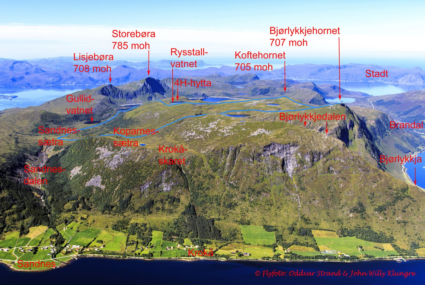 Turen startar frå parkeringsplassen i Sandnesdalen. Etter å ha passert Gullidvatnet går ein dalen heilt til endes på turveg til Kleiva som er det aller høgste punktet på turvegen. Der er det skilta mot Koftehornet og Bjørlykkjehornet. Ein tek ein til høgre og fylgjer ryggen mot nord. Dette er det brattaste partiet på turen. Etter kvart går ryggen over i vidare og slakare landskap og ein kjem opp til Rystallvatnet 629 m.o.h. der ein gjerne kan ta ein pustepause ved ei av 4H-hyttene. Begge desse hyttene er opne og kan brukast av turfolk. (Allereie 300 meter etter parkeringsplassen er det skilta ei alternativ kortare og brattare rute til Rystallvatnet og 4H-hyttene.) Frå 4H-hyttene går turen vidare over Vardeheida og vidare utover i lett og flatt terreng til Koftehornet 705 m.o.h. der det er flott utsikt, spesielt mot havet i vest og Lisjebøra og Storebøra i sørvest. Det lette terrenget held fram utover til Bjørlykkehornet 707 m.o.h. der det er endå betre utsikt mot øyane og havet enn det er på Koftehornet. Ei alternativ rute til Bjørlykkehornet finn du på: http://mrfylke.no/Morotur/Turar/Bjoerlykkjehornet-Rute-2