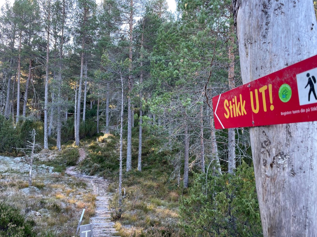 Parkering ved Sekken kirke. Stien starter rett ved bautaen over Håkon Herdebrei på Sekkenes.