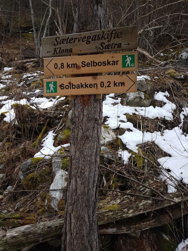 Derifrå går du den gamle bygdevegen gjennom skogen (ca 250 meter) til du kjem opp på asfaltert veg att. Følg bilvegen vidare oppover forbi to svingar. Rett etter andre svingen, i Almdalen, er det skilta til Selboskar og Solbakken på høgre sida av vegen. Følg skiltinga bratt oppover til Sætervegaskiftet (stidele, skilta) og ta av til høgre mot elva. Eit kort stykke etter at du har gått over brua dukkar Solbakken opp.